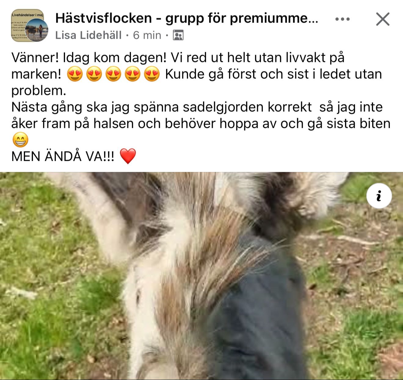 "Jag har haft häst i 40 år och trodde jag kunde mycket om hästar och inte hade så mycket mer att lära. Men så fel jag hade.Under mitt år som medlem i Hästvisflocken ser jag mina hästars välfärd ur helt nya perspektiv o med helt nya ögon. Så enormt mycket jag har lärt mig av dig. När jag hamnar i en situation så tänker jag ofta ”hur hade Susanna gjort här” 🥰