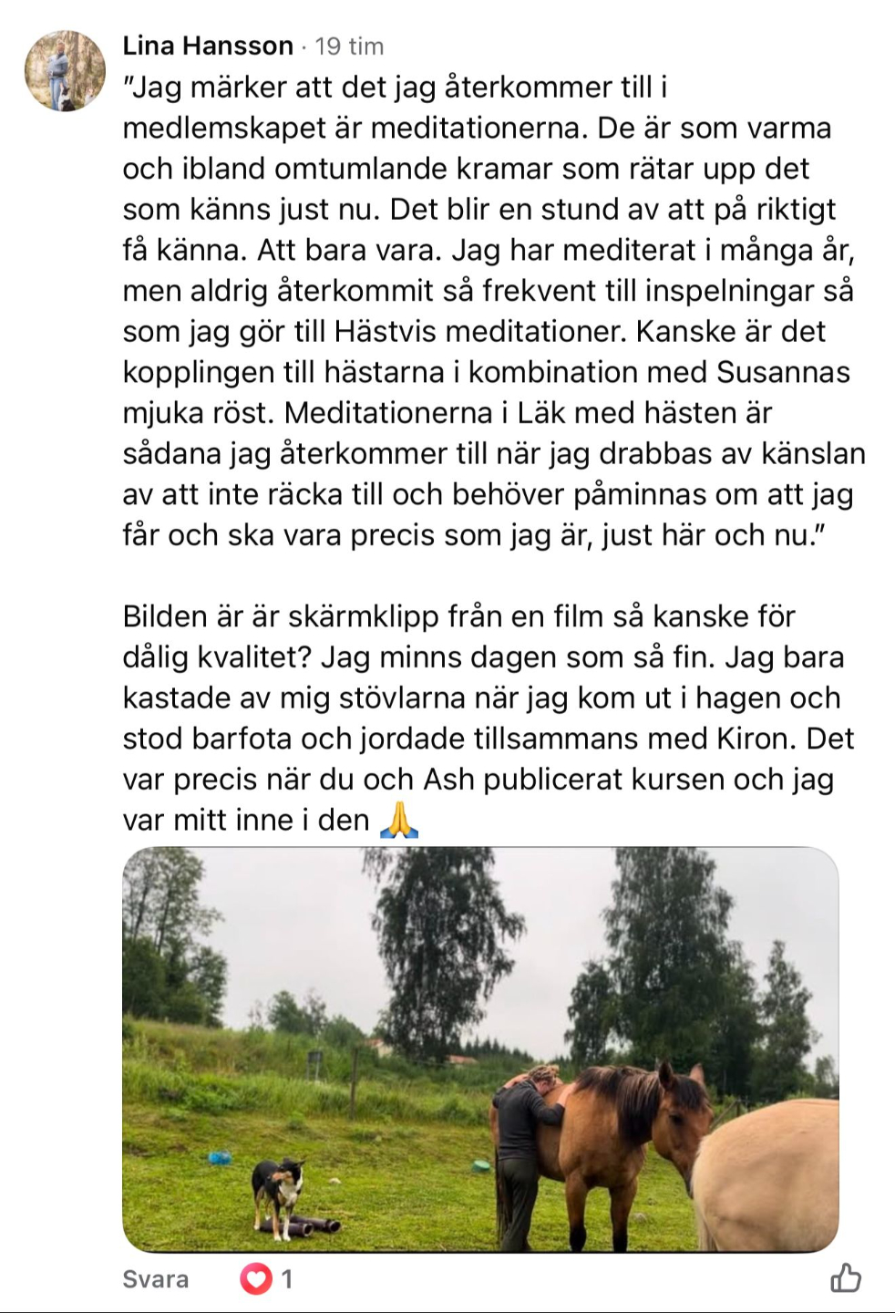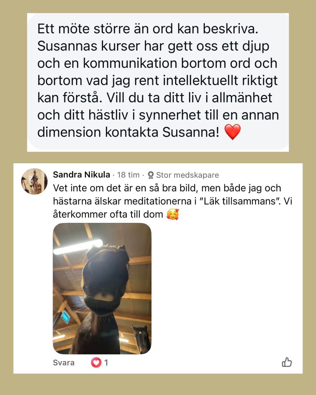 "Min häst har aldrig varit så mycket för kroppskontakt. Idag gjorde jag ljusmeditationen med henne. Hon kommer och ställer sig först så hennes hals rör min axel, sen huvudet över min axel. Tänk, jag som aldrig förstått kraften i meditationer tidigare. Tack Susanna för allt du ger oss."